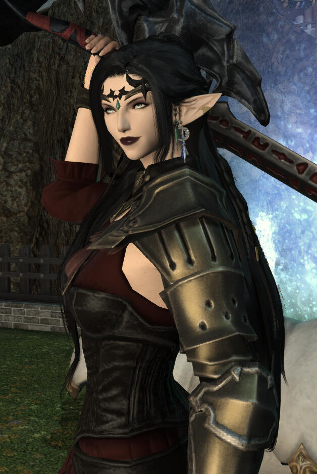 Valeska stands at 6 fulms, 6 ilms tall, though since she is usually wearing heels, she appears around 6’10”. She has smooth pale skin, clear of blemishes of any kind. Her eyes are a piercing light blue, rimmed with red eye shadow and dark, full lashes. Her shapely lips mirror her eyes with a dark red lip stain. Her face is framed by raven-colored locks, forming gentle waves as they flow down to just past her hips. Her body is lithe and supple, like most elezen, but wider at the hips and with a toned musculature. She covers her body, if you could even call it covering, in attractive and revealing clothing. She tends to prefer off-the-shoulder dresses with long sleeves, short front, long back skirt, and a possible slit or two up the legs. Of course, no outfit is complete without a corset to go with it.